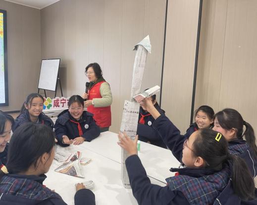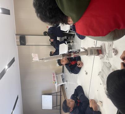 在“平地起高楼”环节,每组两张报纸,让同学们发挥创意,建造一座尽可能高的“高楼”。紧张而充满挑战的20分钟内,同学们分工合作,有的负责设计结构,有的负责粘贴报纸,通过不断的尝试和努力,共同完成了一项令人惊叹的作品。同学们在游戏中收获了成长与快乐,也进一步感受到了团队的力量和合作的重要性。