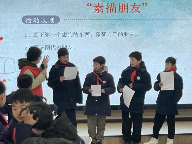 第二个游戏“素描朋友”,充分发挥了同学们的想象力,大家纷纷拿起笔,认真地描绘出朋友在自己心中的形象。最后,邀请学生上台分享绘画心得体会,“重新梳理了和朋友之间的关系”、“觉得和朋友更加亲密”、“不仅锻炼了自己的绘画技巧,还进一步加深了对友情的理解与感悟”。