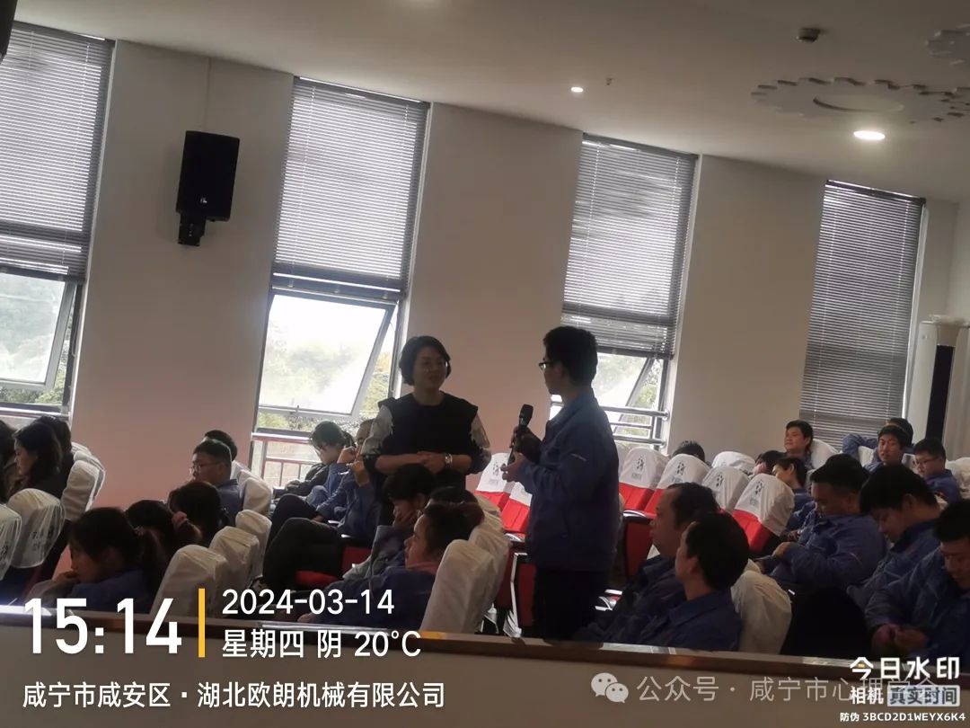 3月14日下午,以“龘龘新一年,朤朤心动力”心理健康讲座在湖北欧朗机械有限公司举行。咸宁市心理学会秘书长、国家二级心理咨询师向艳老师主讲,参加本次活动的有咸安区总工会方长春副主席、周军副主席,湖北欧朗机械有限公司陈羲总经理及职工代表等近100人。