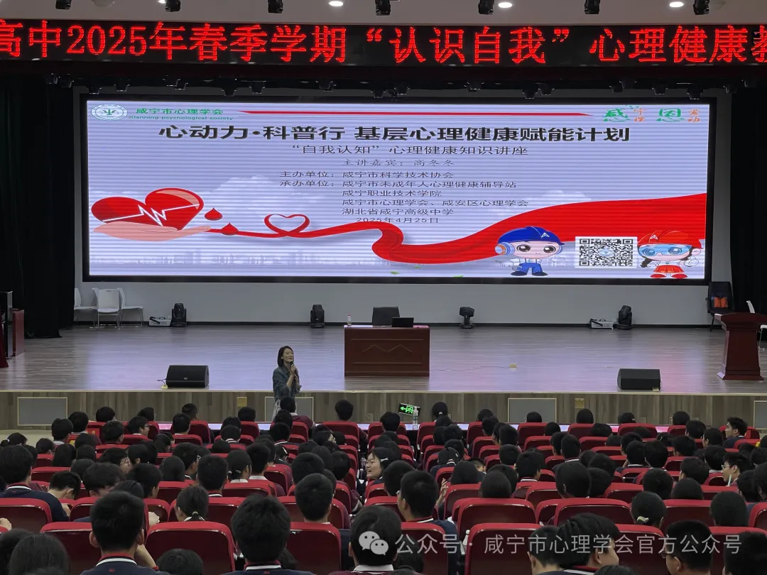 4月25日,“心动力・科普行”基层心理健康赋能计划之“自我认知”专题讲座在湖北省咸宁高级中学成功举办。特别邀请咸宁市心理学会专业讲师高冬冬博士主讲,咸宁高级中学800名学生到场聆听讲座。