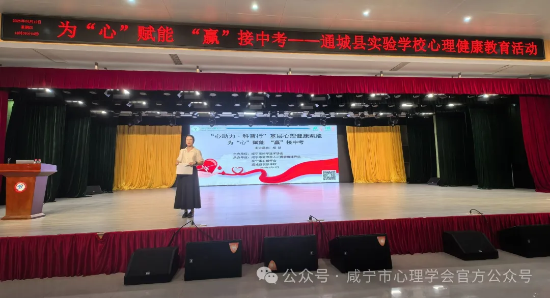 2025年6月12日,“心动力・科普行”基层心理健康赋能活动在通城县实验学校顺利举行。本次活动以“为‘心’赋能‘赢’接中考”为主题,特别邀请马港初级中学的杨慧老师担任主讲嘉宾,为即将参加中考的学生们带来了一场生动且实用的考前心理健康辅导,通城县实验学校300名学生到场聆听讲座。