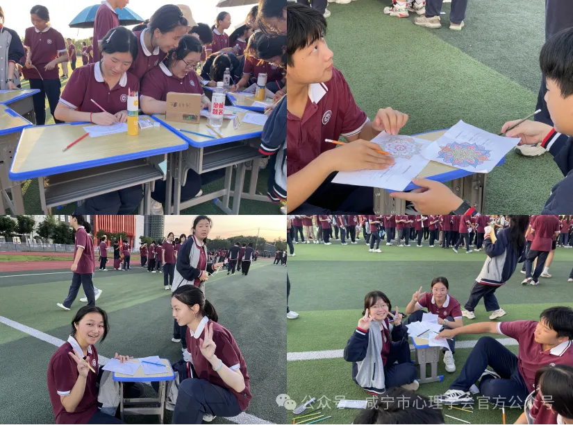 活动以“知识补充、情绪疏导、生涯规划、高考助力”为核心设计六大活动内容。“心”知识补充站通过问题卡片问答,让学生掌握心理疏导求助方式;曼陀罗绘画中,参与者用彩铅在图形上自由着色并延伸创意,在色彩与线条中整合内心秩序。情绪交换站设置“快乐放大器”与“情绪垃圾桶”,同学们分享喜悦、倾诉烦恼,实现情绪的正向流转;生涯彩虹图与“我的名片”活动,则引导学生通过涂描图形、设计未来名片,直观规划个人生涯发展。