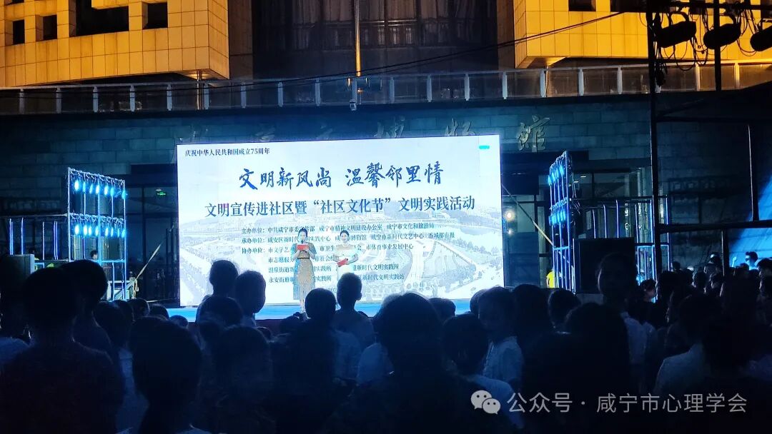 【社区服务】咸宁市心理学会积极参与“社区文化节” 助力文明新风尚(第三周) 2024年07月19日晚 —— 随着夏夜的微风,咸宁市博物馆广场上灯火通明,人声鼎沸。“文明新风尚 温馨邻里情”文明宣传进社区暨“社区文化节”第三场文明实践活动在这里盛大举行。咸宁市心理学会两位心理老师,为市民带来了心理健康知识普及和心理咨询服务,受到了热烈欢迎。...